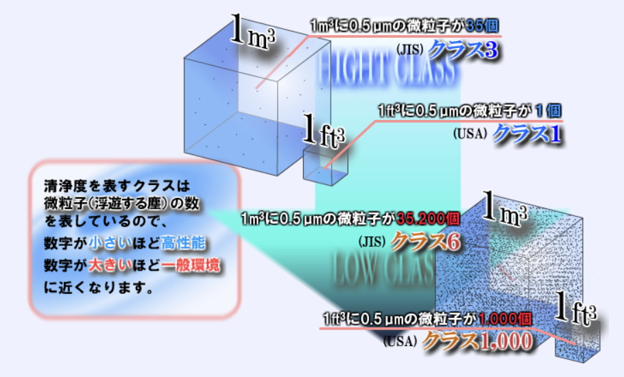 簡単に言いますとクリーンルームの清浄度は1m3(立法メートル)の空気の中のゴミ(塵)の数がどれくらいあるかです!