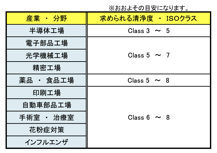 求められる品質は厳しくクリーン度の指標が分からないお客様もいらっしゃるかと思いますので、今回はISOを基準としたクリーン度でご案内したいと思います。
